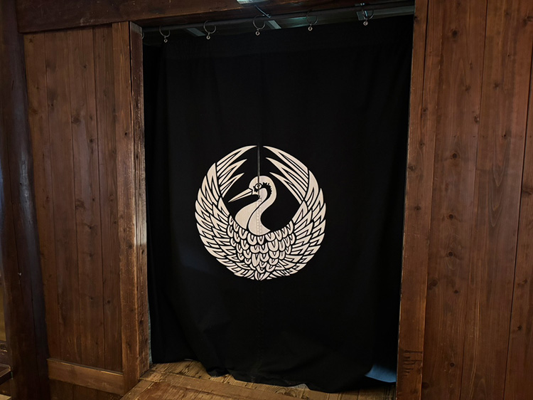 鳥屋に吊るされている幕は「揚幕」です。揚幕の客席側には、旧金毘羅大芝居の座紋である「佐伯鶴」が描かれています。役者は自分の出番になると、幕の小さな隙間から舞台の様子をのぞき、登場のタイミングを見計らいます。