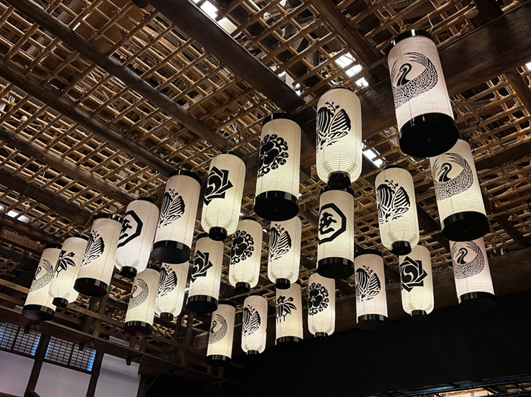 観客席の上に吊るされたひときわ大きな提灯は顔見世提灯と言います。顔見世提灯には、その日の公演に出演している役者の家紋が描かれており、観客は、提灯を見ることで、どの役者が出演していて、その役者がどの格付けにいるのかを知ることができました。一つの大きさは、高さ1.2m、幅45cmにもなります。