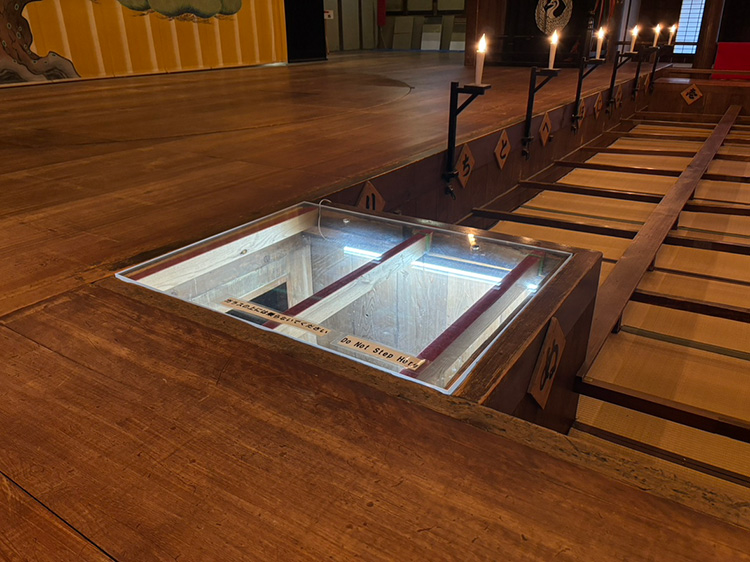 鳥屋は地下通路で舞台裏ともつながっており、役者は観客に見られることなく舞台裏を行き来することができます。