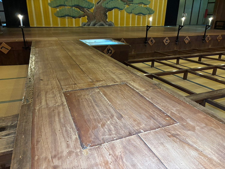 地下の奈落とつながっており、お芝居の中では井戸や池に見立てられたり、役者の出入りや早替わりに使われたりしています。