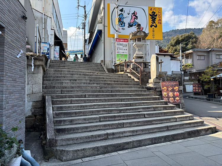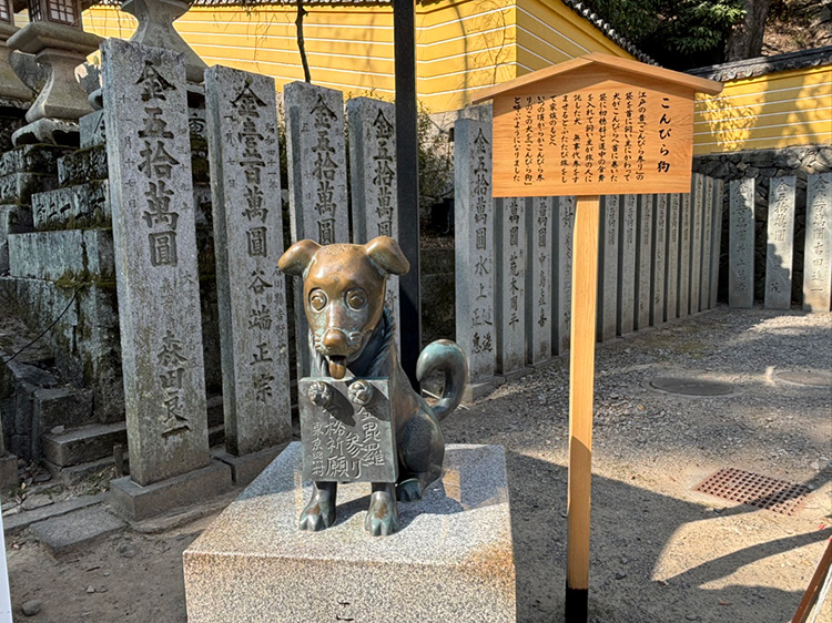 階段の下で出迎えてくれるのが、「こんぴら狗」の銅像です。イラストレーターの湯村輝彦氏が、親しみやすくコミカルな姿でデザインしました。