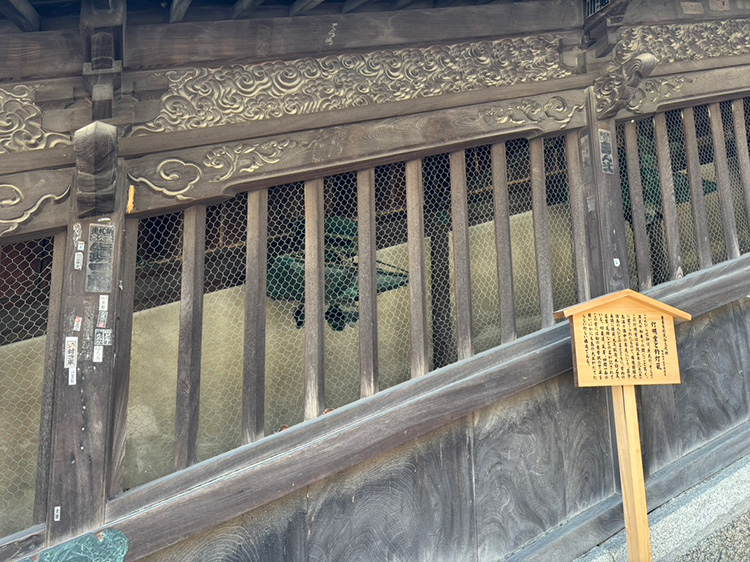 側面に彫られた魚や水に関わる生き物の彫刻は、火災から建物を守る意味が込められています。
