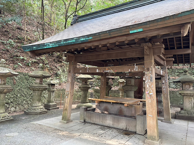神社では、本殿に向かう前に、手と口を清めるのが習わしです。現在の「手水舎」は、もともと御本宮の北側にありましたが、昭和5年(1930年)に展望台が造られた際、ここへ移されました。