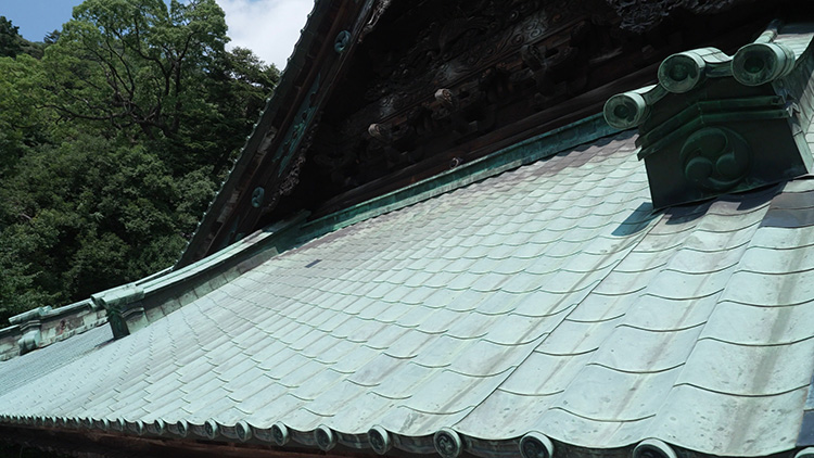 À l’origine, le toit d’Asahi-sha devait être recouvert de tuiles en céramique, mais celles-ci étant trop lourdes, environ 10 000 plaques de cuivre légères, façonnées une à une à la main en forme de tuile, ont finalement été utilisées.