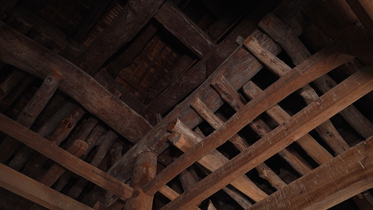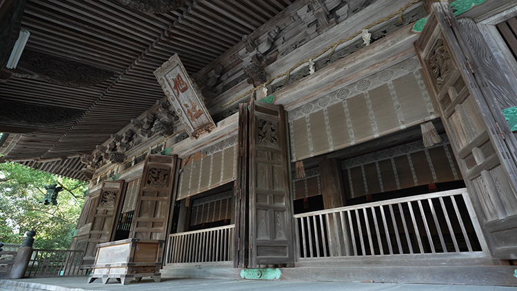 Presque toutes les surfaces en bois du bâtiment sont ornées de sculptures élaborées. Les surfaces planes sous les avant-toits sont ornées de nuages tourbillonnants, tandis que des sculptures de dragons et d’autres créatures s’étendent le long des chevrons odaruki et que des poissons nagent à travers les panneaux latéraux. Les animaux associés à l’eau étaient souvent ajoutés à des structures en bois comme celle-ci, en guise de talismans contre les incendies. Les pignons supérieurs sont également ornés de symboles de bon augure. Une grue est sculptée sur un pignon et une tortue sur l’autre. Ces deux animaux sont des symboles de longévité.
