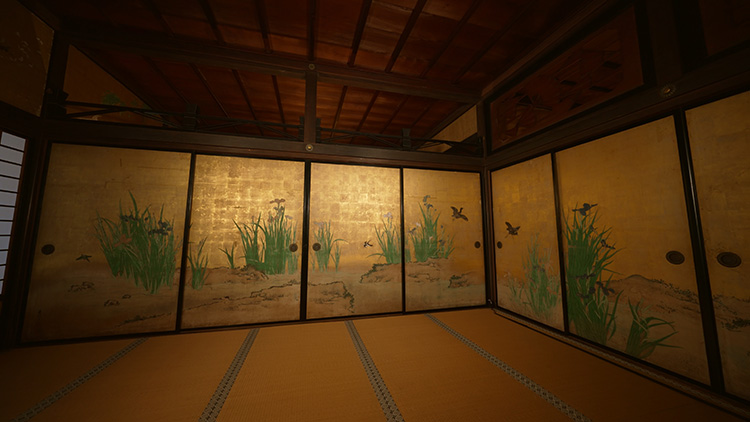 오쿠서원 동쪽에 있는 두 개의 방에는 목가적인 물가 풍경이 펼쳐져 있습니다. 새와 기타 동물 그림으로 알려져 있던 19세기 초 화가 간타이의 작품입니다. 그중 하나의 방에는 그의 작품 ‘물가의 버드나무와 흰 왜가리’가 걸려 있는데, 왜가리들이 날아올라 늘어진 버드나무잎을 가로질러 얕은 물가에 내려앉는 모습이 담겨 있습니다.