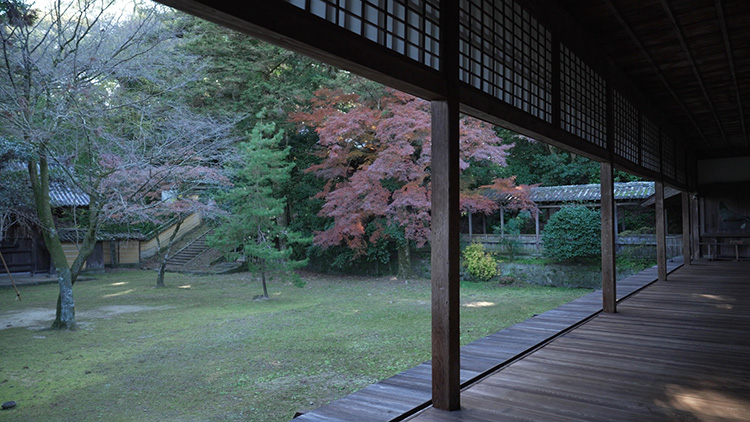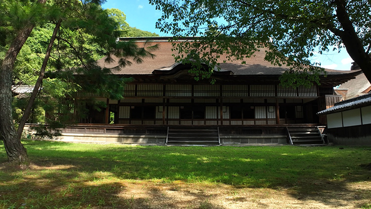 오모테서원은 1659년경에 세워졌습니다. 이 건물에는 경사가 가파른 노송피 지붕널로 된 팔작지붕이 있는데, 이는 전통 일본 건축에서 흔히 볼 수 있는 특징입니다. 내부에는 미닫이문으로 구분된 일곱 개의 방이 있습니다. 각각의 문을 닫으면 방문객들은 작품에 둘러싸이게 되고, 문을 열면 정원 풍경이 관람 경험에 어우러지게 됩니다.