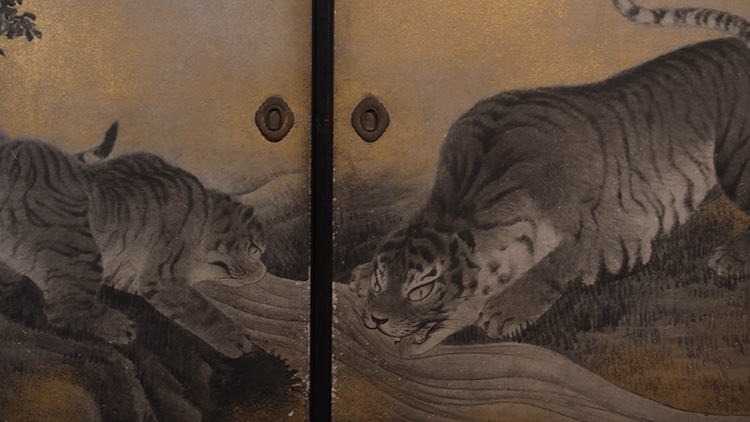 옆방으로 가보면, 호랑이들이 벽 위에서 어슬렁거리고 있습니다. 호랑이는 일본 토착 동물이 아니며, 오쿄가 살아 있던 당시 일본에는 살아 있는 표본이 존재하지 않았습니다. 이에 그는 보존 처리된 가죽과 흔히 접할 수 있는 ‘가까운 친척’인 집고양이를 참고해 그림을 그렸습니다.