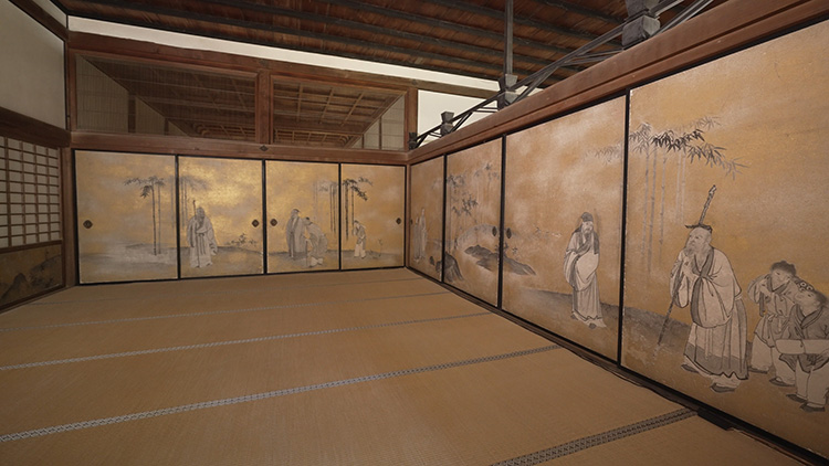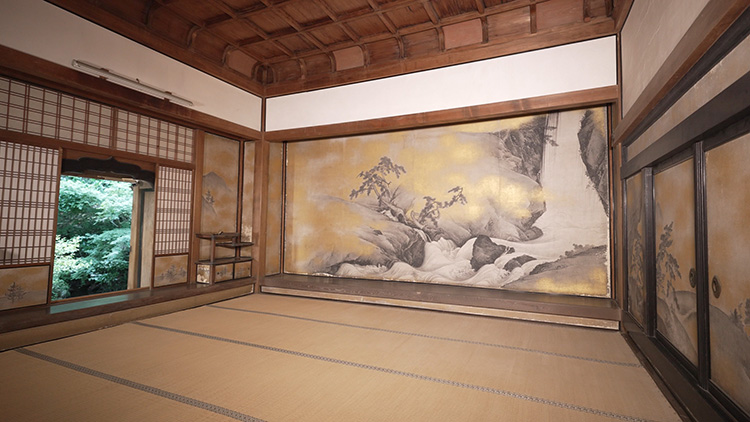‘산 경관의 방’에는 가장 높은 지위의 손님들만 앉을 수 있었던 높은 좌석 공간이 있습니다. 벽화에는 거센 폭포수가 떨어지는 모습이 담겨 있는데, 이는 오쿄의 가장 뛰어난 작품 중 하나입니다. 벽에 묘사된 물줄기는 바깥 정원에 있는 연못으로 매끄럽게 흘러 들어가는 것처럼 보입니다.
