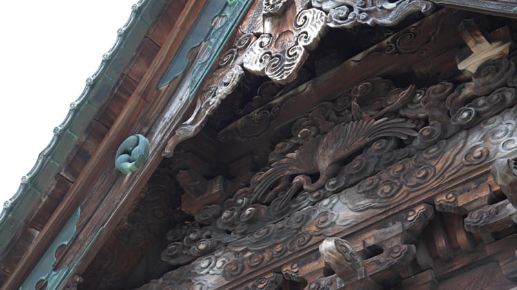 박공 하나에는 커다란 학이, 다른 박공에는 커다란 거북이 새겨져 있습니다. 이 동물들은 각각 천 년, 만 년 동안 사는 것으로 전해집니다. 이처럼 학과 거북은 일본 미술 전반에서 상서로운 장수의 상징으로 등장합니다.