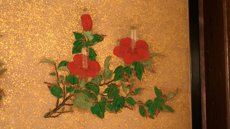 The most famous space in Oku Shoin is the Dais Room, which is adorned with the work of eighteenth-century master painter Itō Jakuchū. This art piece is titled A Hundred Flowering Plants. It encompasses 201 vivid illustrations of flowers in bloom, including hydrangeas, lotuses, peonies, and chrysanthemums. It even includes plants that were uncommon in Jakuchū’s native Kyoto, like hibiscus. These flowers were originally painted against a stark white background, but the white space was later coated in shimmering gold dust.