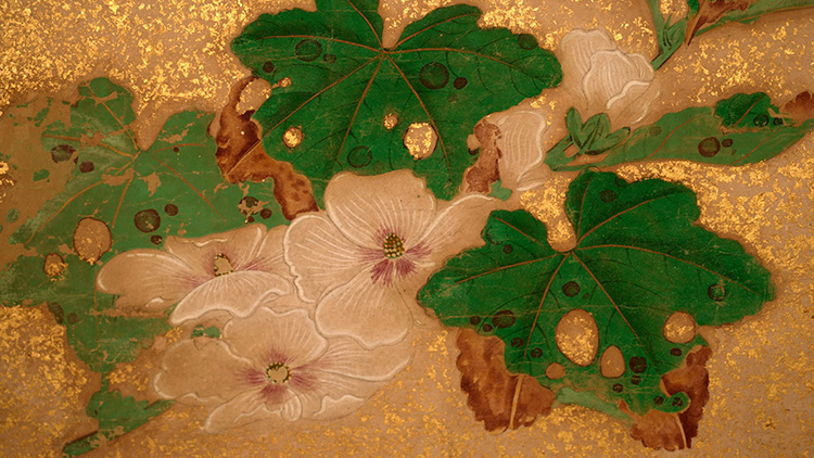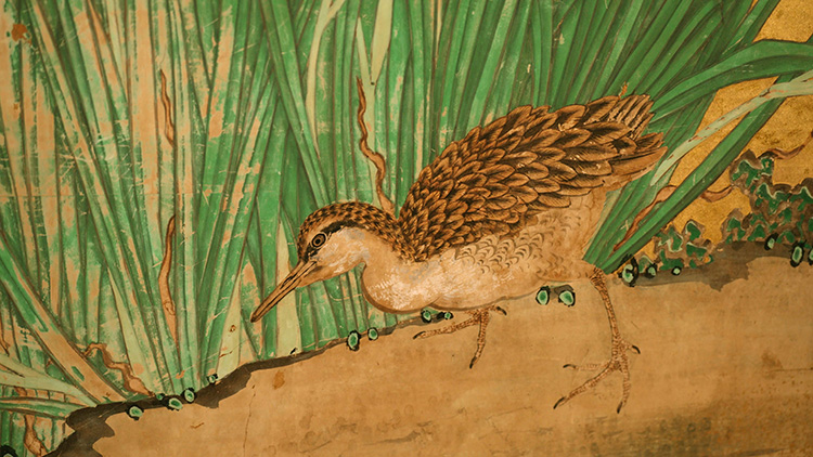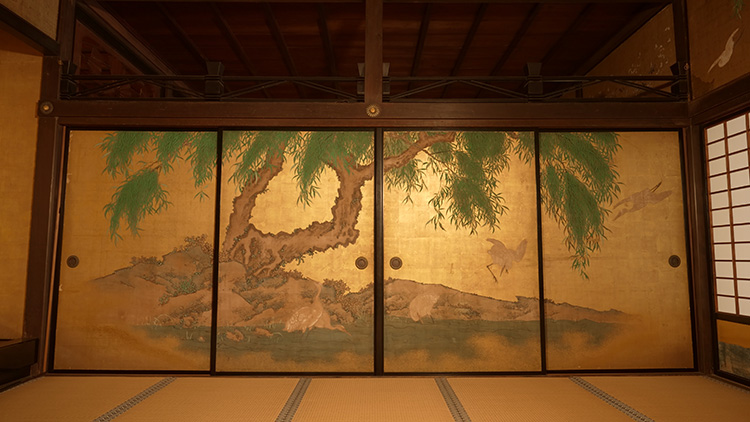 Two rooms on the eastern side of Oku Shoin feature idyllic waterside scenes. These were painted by the early nineteenth-century artist Gantai, who was known for his paintings of birds and other animals. In one room, Willow Trees and White Herons at the Waterside depicts herons taking flight, soaring past the leaves of a weeping willow, and gliding to rest in the shallows.