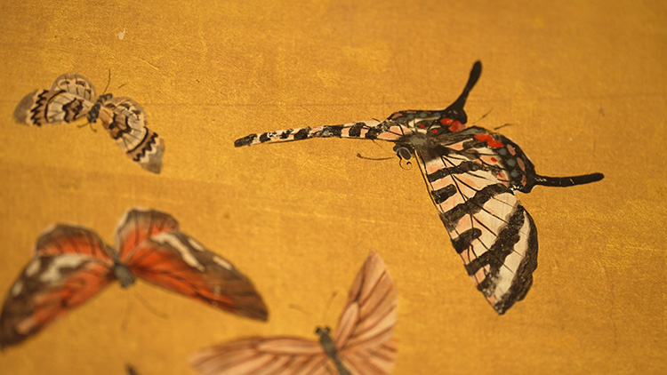 Four upper panels in the same room are covered by a flock of over 400 butterflies depicted in minute detail. Gantai is thought to have based these butterflies on specimens collected by a local naturalist. In the painting they appear animated, flying in a swarm toward the real-life garden that overlooks the plains and mountains below.