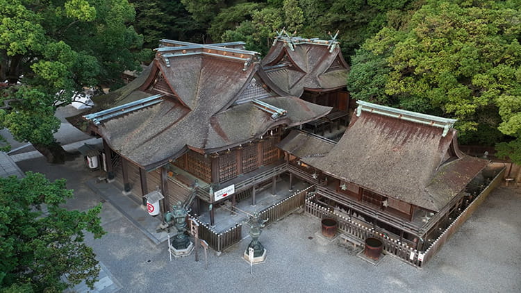 Le bâtiment principal du sanctuaire est doté d’un toit à croupe et à pignon avec des bardeaux en écorce de cyprès traditionnels. L’intérieur et l’extérieur du bâtiment sont ornés de fleurs de cerisier représentées en laque urushi saupoudrée de poudre d’or.