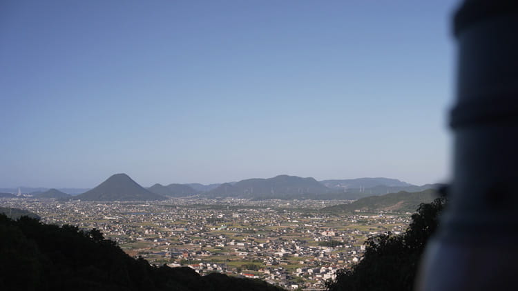 La vue depuis le bâtiment principal donne sur la plaine verdoyante de Sanuki. Au loin, on aperçoit la mer intérieure de Seto ainsi que le mont Iino, en forme de cône, surnommé « Sanuki Fuji » en raison de sa ressemblance avec le mont Fuji.