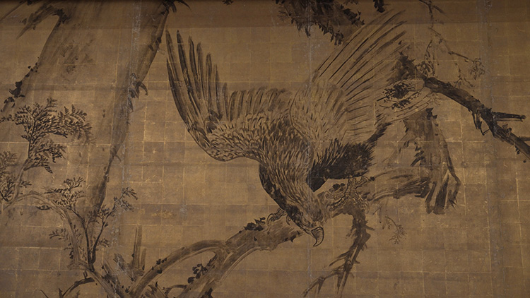 문간방에는 편백나무에 앉아 쉬고 있지만, 금방이라도 먹이를 덮칠 듯이 날개를 활짝 편 독수리가 그려진 그림이 가장 두드러집니다. 모리 간사이가 그린 이 역동적인 작품은 금박 위에 먹으로 그려졌습니다. 그가 활용한 스타일과 주제는 전임자이자 다음 다섯 개 방에 그림을 그린 마루야마 오쿄의 것과 유사했습니다.
