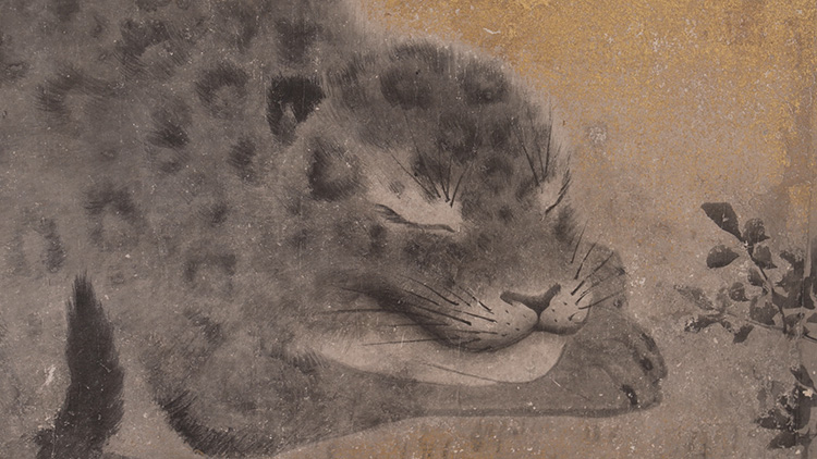 옆방으로 가보면, 호랑이들이 벽 위에서 어슬렁거리고 있습니다. 호랑이는 일본 토착 동물이 아니며, 오쿄가 살아 있던 당시 일본에는 살아 있는 표본이 존재하지 않았습니다. 이에 그는 보존 처리된 가죽과 흔히 접할 수 있는 ‘가까운 친척’인 집고양이를 참고해 그림을 그렸습니다.