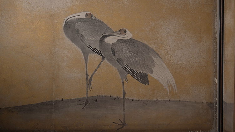 ‘학의 방’에 있는 오쿄의 그림에 묘사된 학들은 물속을 헤치며 걷고, 하늘을 날고, 잠을 자는 모습입니다. 자세히 들여다보면 이들은 모두 서로 다른 토착종으로, 자연학자에 버금가는 정확함을 바탕으로 묘사했음을 알 수 있습니다.