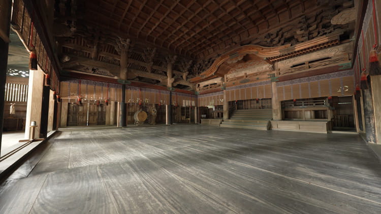 建立された当初、来訪者は一階の金堂に安置された大きな薬師如来像を参拝しました。寺院の御本尊は来迎柱と呼ばれる2本の柱の間にある来迎壁の前に構えた須弥壇に安置されることが多いのですが、旭社ではこの来迎柱を背面の柱節位置まで後退させ、また参拝専用空間としての外陣は設けないことで、参拝対象への視界を遮るものがなく見渡せる広々とした空間を創り出しました。これは天井の上に縦横に架け渡された梁組で、上部の荷重をうまく下重外周の柱に伝えることで実現されています。