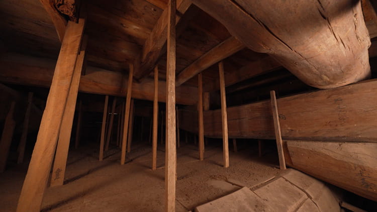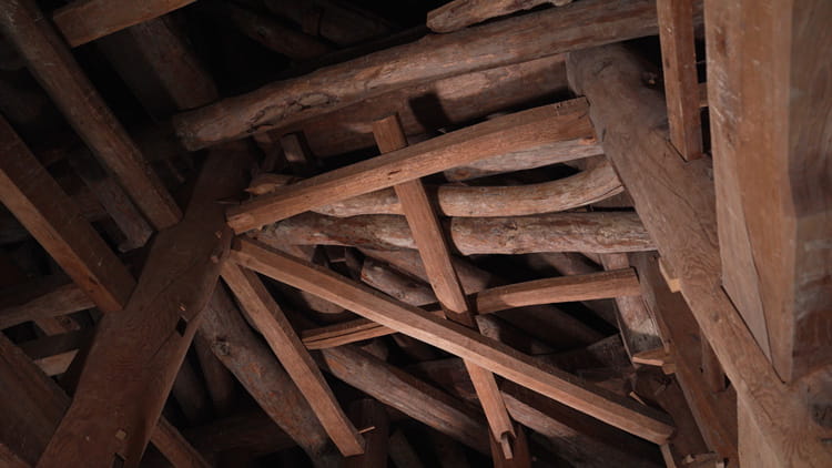 人が見る場所にある梁と柱が、木目の美しく強固な欅材で造られているのに対し、小屋裏にあって見えない桔木は、より曲げに強い松材で造られていて、その部材がどこに用いられ、どのような力がかかるのかによって、使い分けられています。