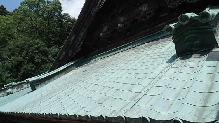 当初、金堂は瓦を重なり合わせる伝統的な屋根構造で設計されました。しかし、この構造では瓦の重量を支えきれないということで、瓦を模した形状の銅板を採用しました。このためには約1万枚の銅板が必要で、それぞれが個別に成形され、瓦の重なり模様に合わせて配置されました。真新しかった銅は、約200年の歳月を経て、緑青へと変化しています。