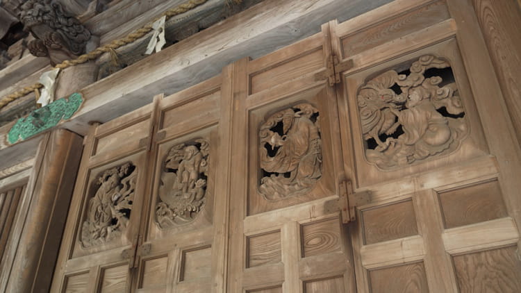 出入り口は建物の正面と両側面に設け、三方とも両開きとしています。各扉とも格子状に組んだ桟に板をはめ込んだ桟唐戸と呼ばれる形式で、鎌倉時代に中国から伝わって以来広く用いられています。旭社では、それぞれの扉の中央に折り畳み式の蝶番が設けられており、開いた際にきれいに半分に折り畳めるようになっています。各扉の上部には透かし彫りが施され、それが空気と光を室内に取り込む役割を果たしています。